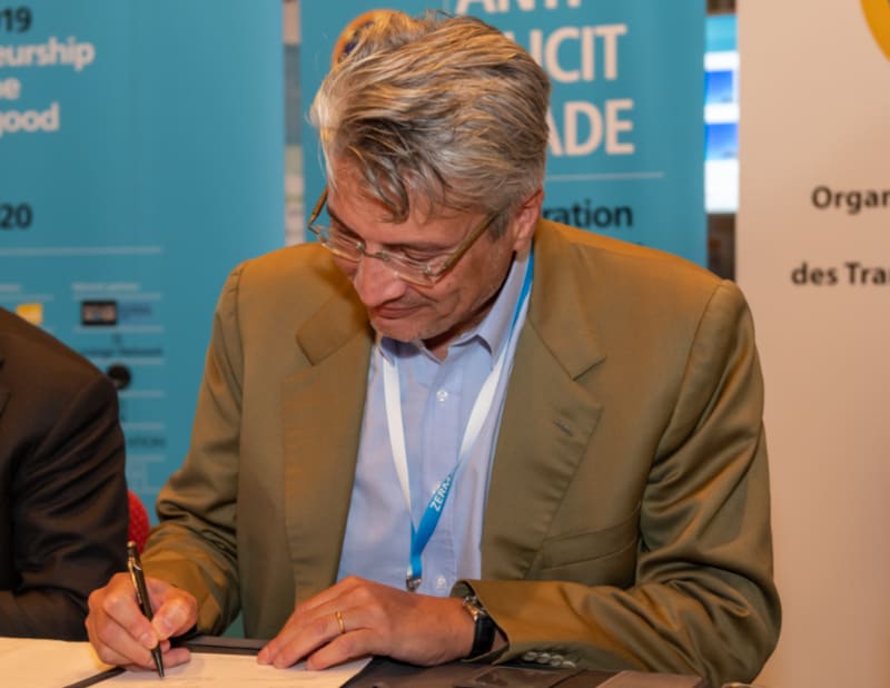 Alvise Giustiniani signing the Anti-Illicit Trade Declaration on behalf of PMI (Above)